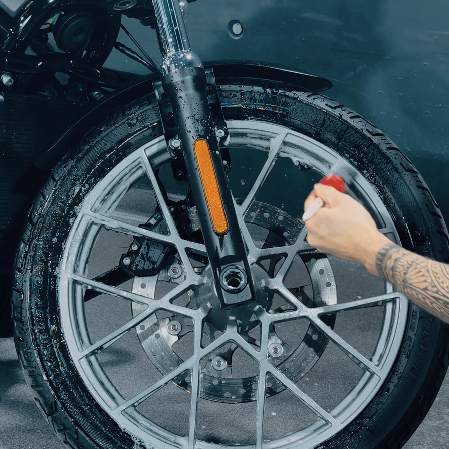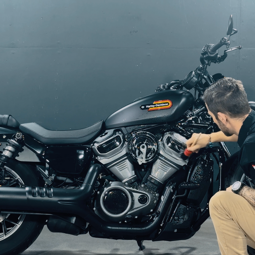 - Spray SWISSVAX Supreme Motorcycle Cleaner onto the cold, dry surface, spread the cleaner with a brush and leave it to work for 1-2 minutes, then gently rinse the vehicle again with the high-pressure cleaner.
