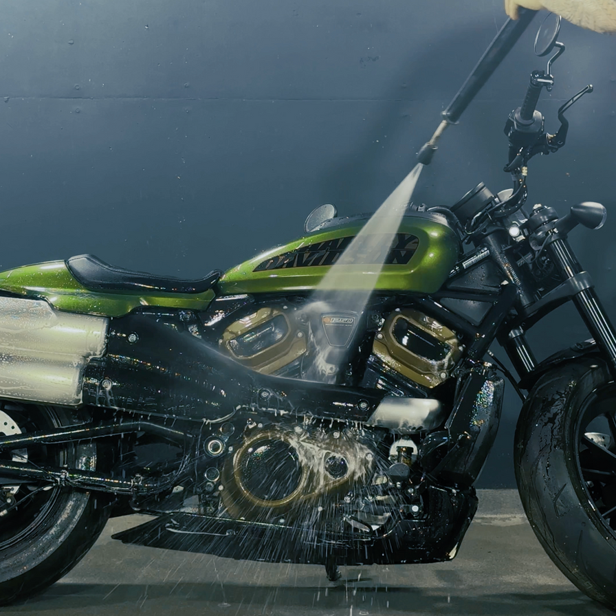 - Spray SWISSVAX Supreme Motorcycle Cleaner onto the cold, dry surface, spread the cleaner with a brush and leave it to work for 1-2 minutes. Gently rinse the vehicle again with the high-pressure cleaner.